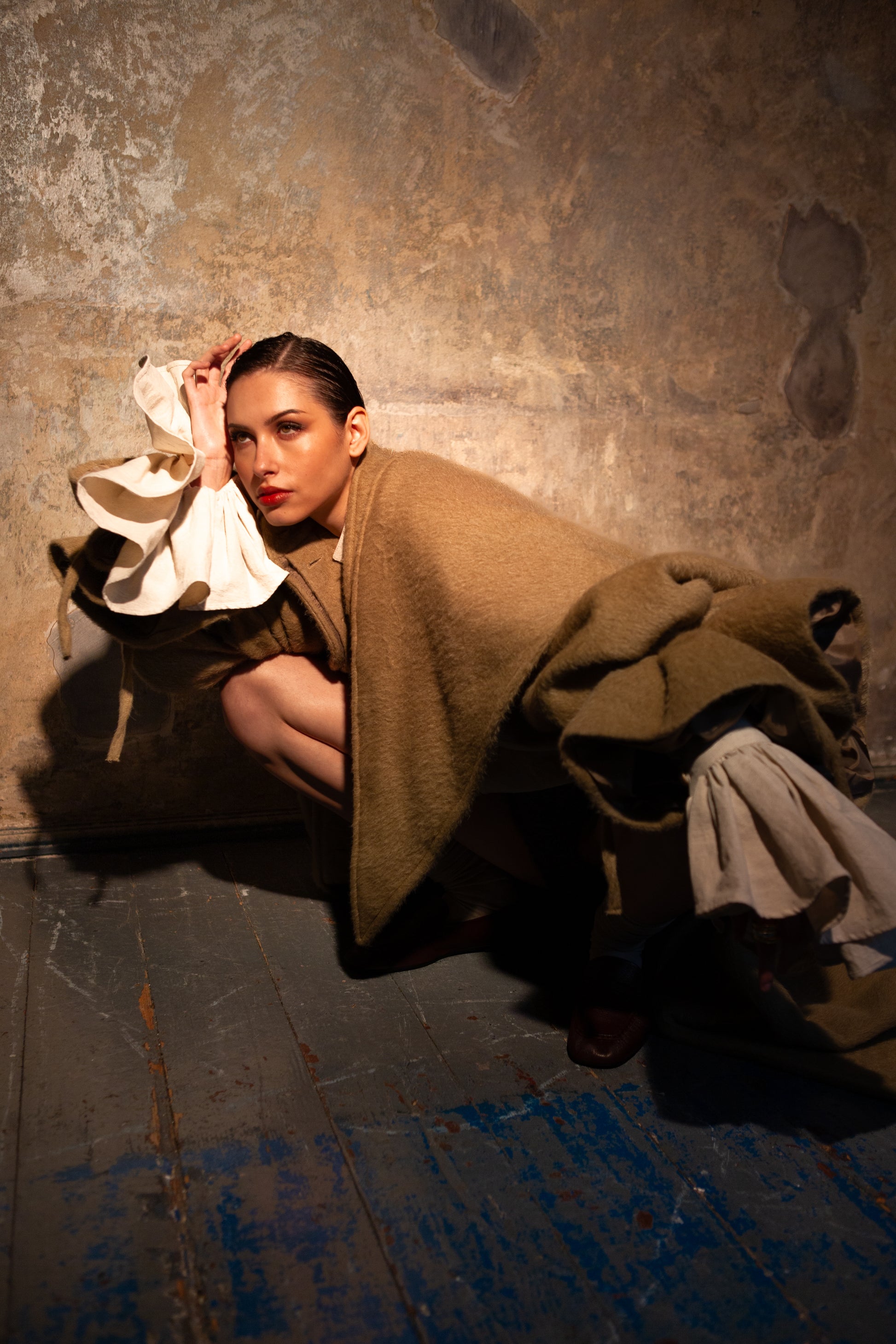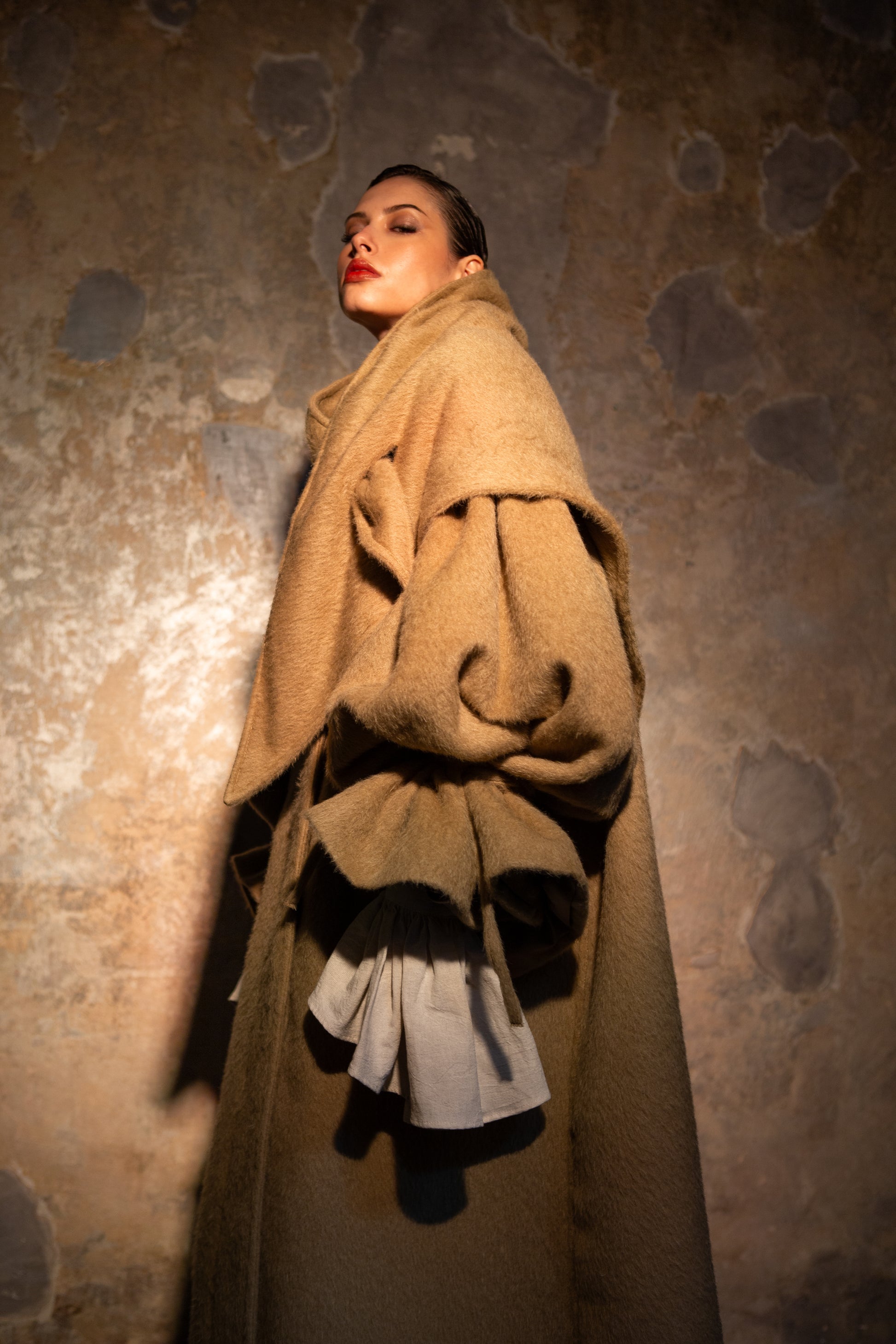 Icon coat blending wool and volume, romance and timeless silhouettes. A playful masterpiece with versatile sleeves and a huge detachable headscarf. It’s like an old good movie.